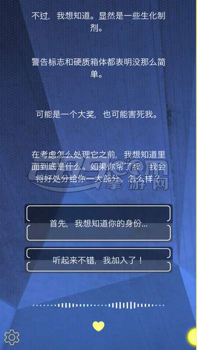 文字冒险游戏《The Virus: 求救》讲述了在末日僵尸世界中冒险的故事。在游戏的开场,玩家就接收到了来自名为汉娜的女性发送的求救信息。从她的描述可以得知,她正在被一帮子持枪的卫兵追杀,而原因就是她手上捡到的神秘盒子,它来自于一个从研究所中逃出的死者。而玩家需要帮助她度过重重难关,作出许多决定,这箱子究竟是能拯救人类的疫苗,还是毁灭世界的病毒?汉娜究竟会帮助这个城市获得新生,还是彻底将其毁灭,这都会因玩家的选择而作出改变。