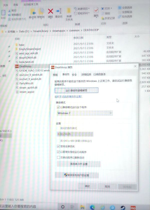 3、第二步完成后还是闪退的,浏览游戏本地文件夹,右键Deathloop.exe兼容性,设置方法如下图所示。