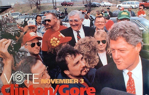 1992年,希拉里的丈夫比尔克林顿竞选美国总统。这是一张极度亲民且写实的"真人海报",与其他总统候选人海报所展现的那种"高高在上"感不同,克林顿在这张海报里被众人簇拥着,既有"中心感",也与选民非常"亲近"。