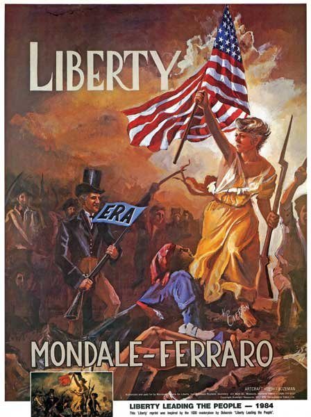 这张竞选海报出现在1984年的总统竞选中,前副总统蒙代尔(也许还有他的设计师)以法国名画《自由引导人民》为灵感,把自己和竞选伙伴放在海报里,"领导"美国人民,挑战当时备受喜爱的前总统里根。