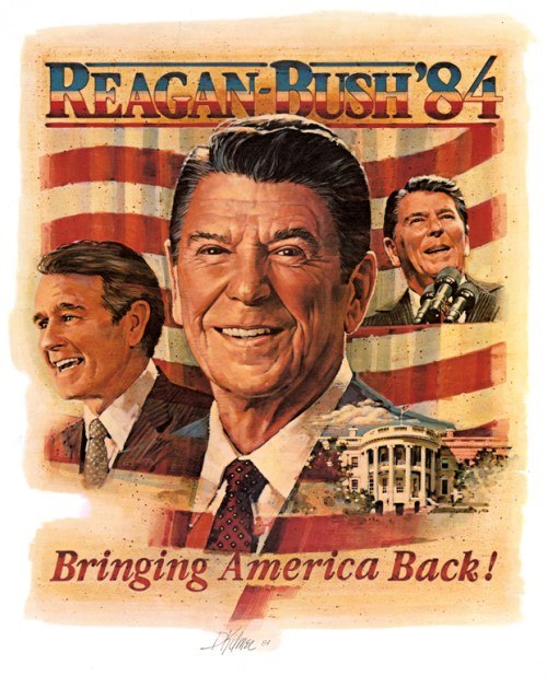 还是1984年,只不过海报主人公是当时笑到最后的里根。里根在进入白宫前是著名演员,万人迷,极善演讲,80年代的"奥巴马"。他喊出的口号是"Bring America Back",力压了上图主人公蒙代尔的"自由引导人民"。