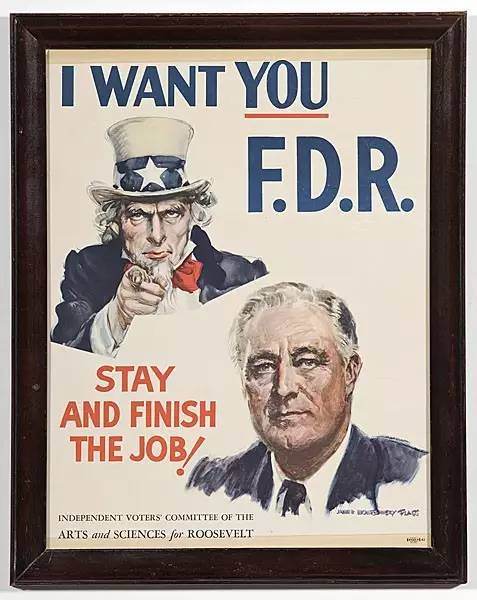 依旧是罗斯福,依旧是1944年。这一年,罗斯福已经病重,但是二战的局势令他难以离任。这张海报是其支持者绘制的,非官方出品。在海报中,代表着美国形象的山姆大叔指着罗斯福说:"我要你留下来,完成这份工作。"